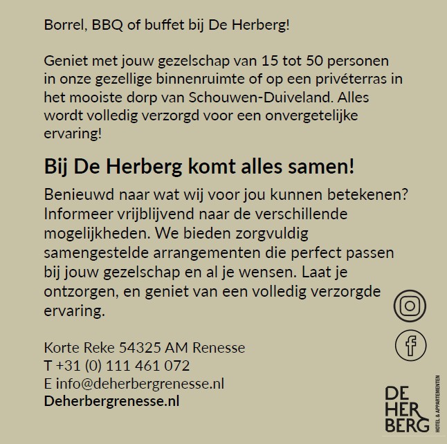 Iets te vieren? Kom samen bij De Herberg. Voor een onvergetelijke verjaardag, bedrijfsborrel, babyshower of andere bijeenkomst. In het sfeervolle hart van Renesse. U kunt bij ons terecht met groepen tussen de 20 en 50 personen. Op ons gezellige terras dat volledig voor u ter beschikking staat. Eventueel in combinatie met onze ontbijtzaal of onze hotelkamers en appartementen. Zin in borrelhapjes, taart, BBQ of een buffet? Zoet, hartig, met vis, vlees, liever vegetarisch of vegan? Het is allemaal bespreekbaar. Dat geldt ook voor muziek, inrichting en decoratie.